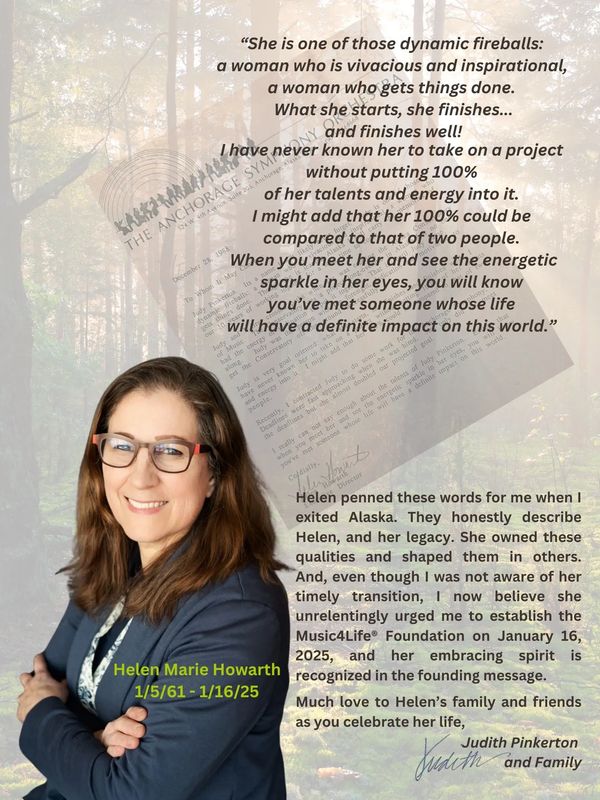 The Music4Life® Foundation was officially established on January 16, 2025, in honor of Helen Howarth, a beloved friend of Founder Judith Pinkerton, LPMT, MT-BC. The Foundation’s inception, coinciding with Helen’s passing in Anchorage, Alaska, reflects a deeper calling to advance healing through music. Judith’s decades of nonprofit leadership and music therapy expertise laid the groundwork for a unique mission-driven organization positioned to address the growing mental health crisis.